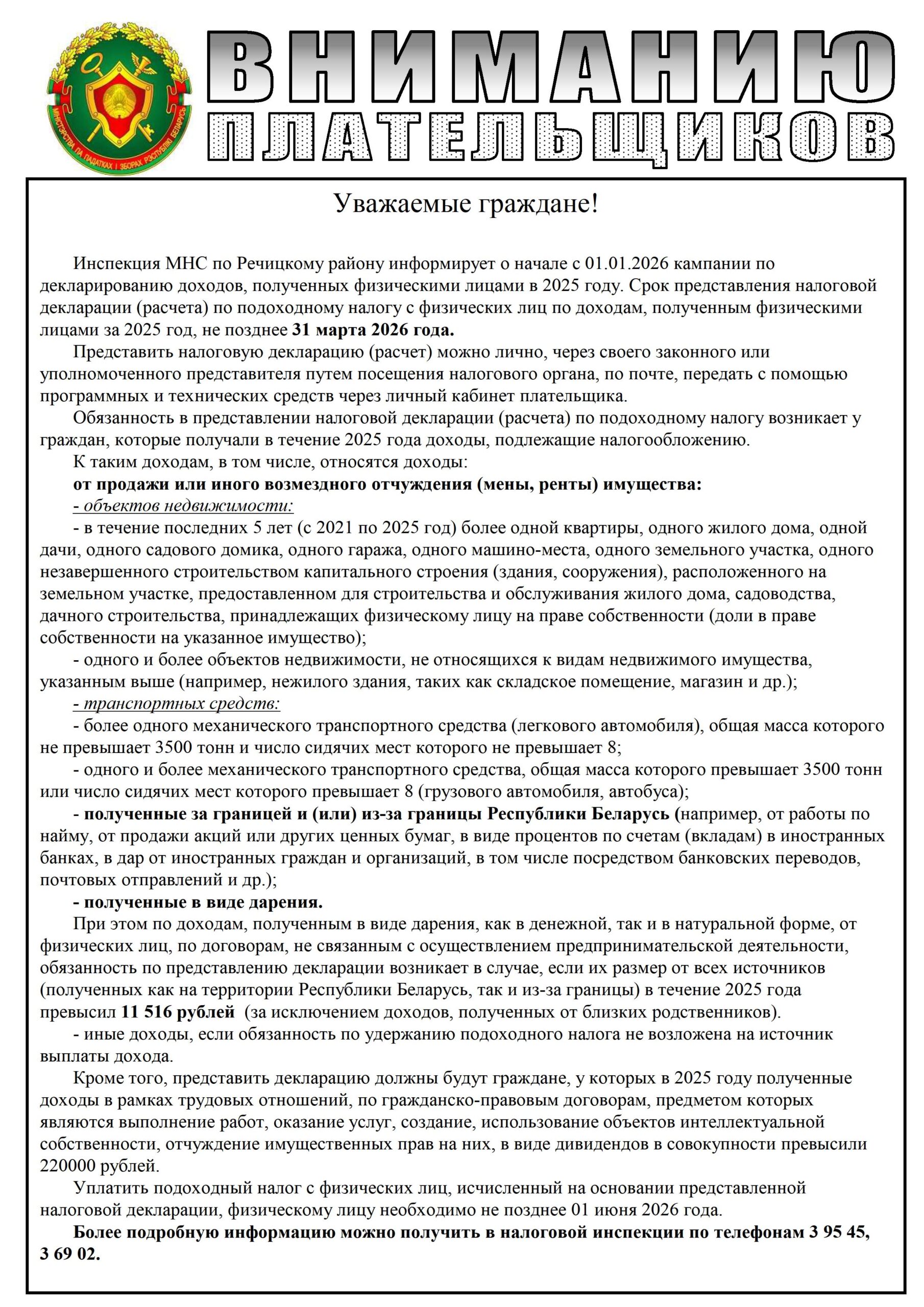Инспекция МНС по Речицкому району информирует о начале c 01.01.2026 кампании по